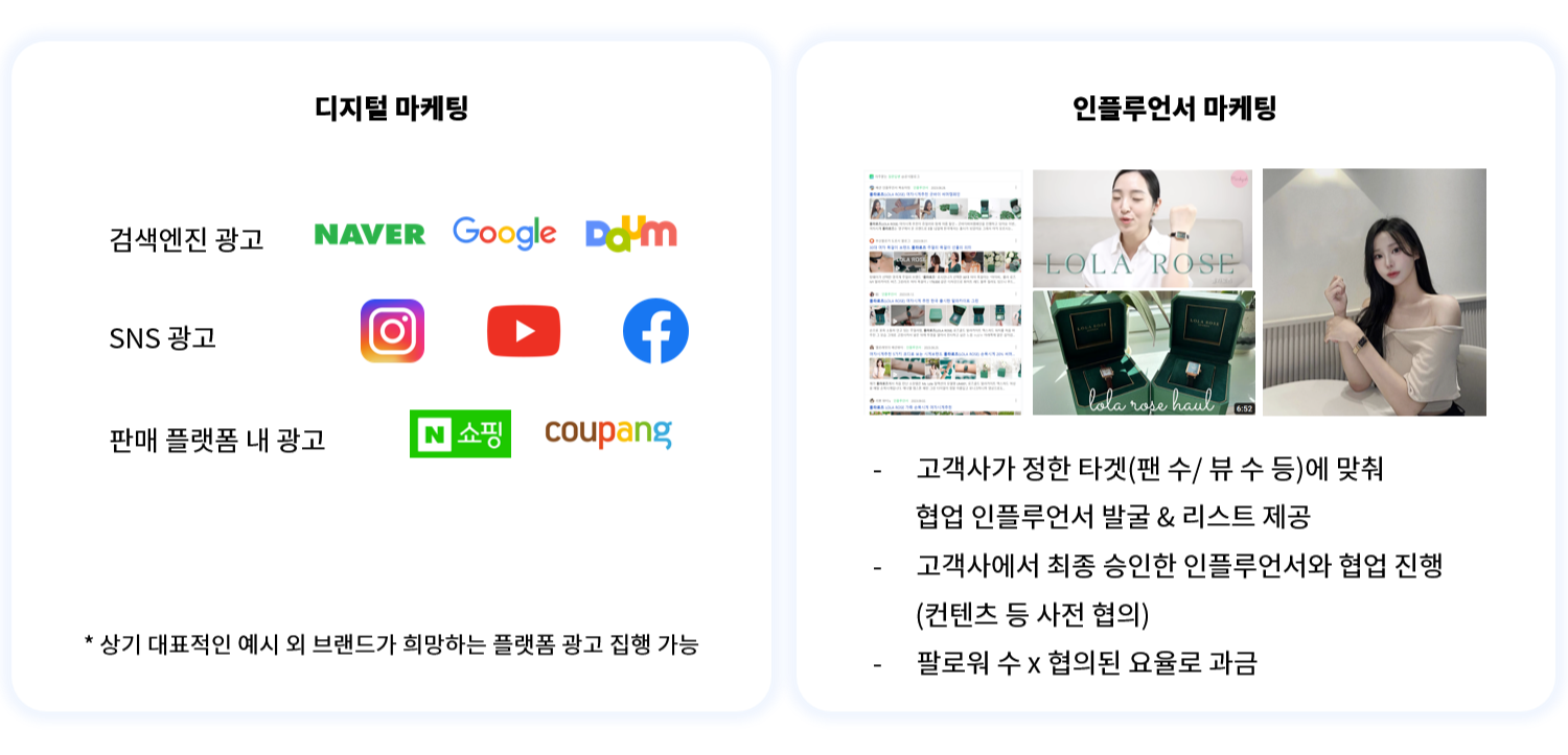 디지털 마케팅과 인플루언서 마케팅을 통해 외부 채널로부터 브랜드 쇼핑몰로 잠재 고객을 유입시킵니다.